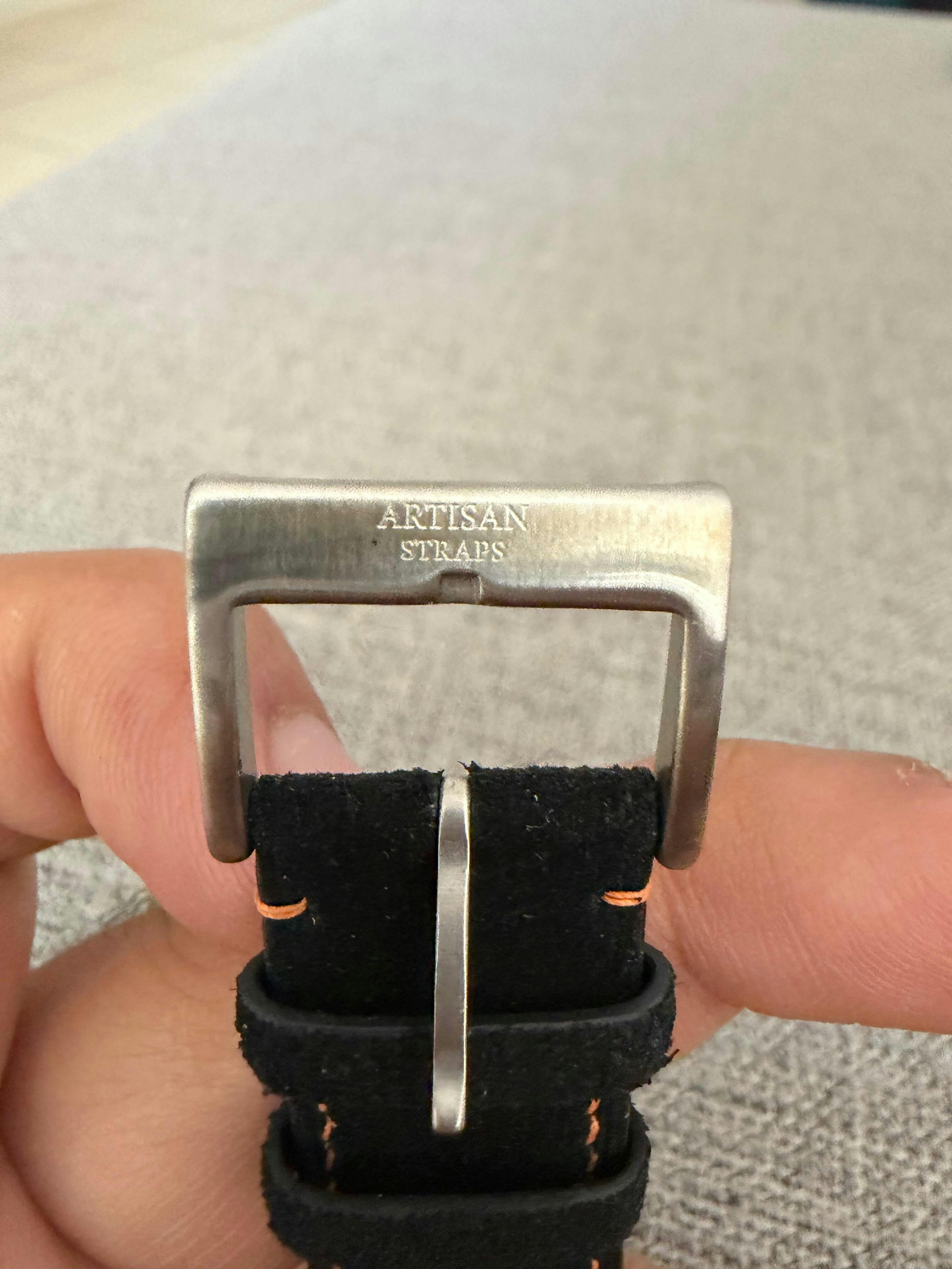 Nuestras correas vienen instaladas con una hebilla de acero inoxidable 316L que lleva grabado el logotipo de Artisan Straps. Esta hebilla viene con orificios para las asas que permiten quitarla fácilmente sin dañar la correa.