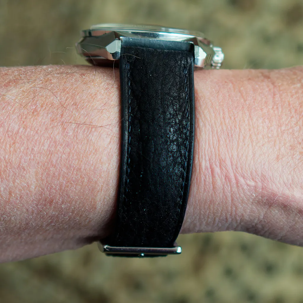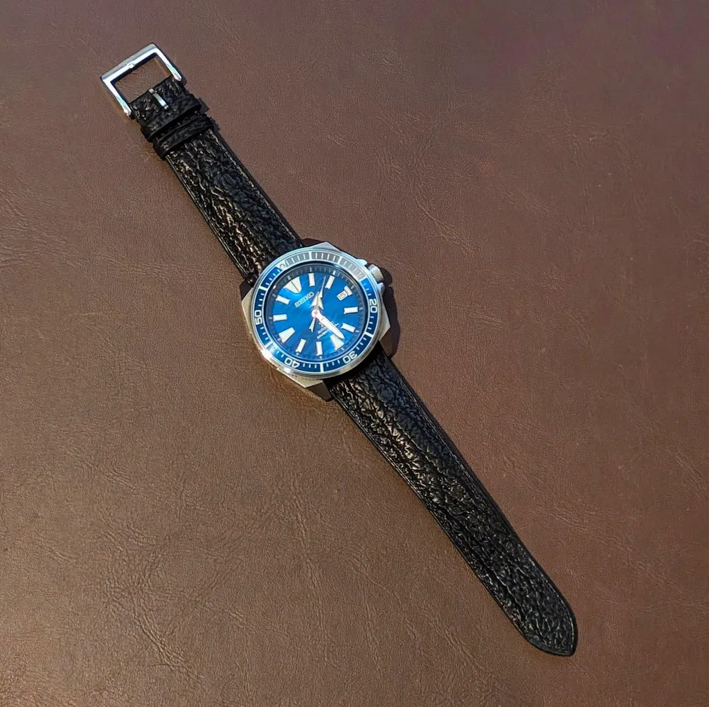 Our Black Shark Leather is a supple leather from the USA, from the waters of the Caribbean. Shark leather is renowned for its unique deep multidirectional grain. This particular sharkskin has a fine soft finish with a subtle sheen making it great as a casual strap option.