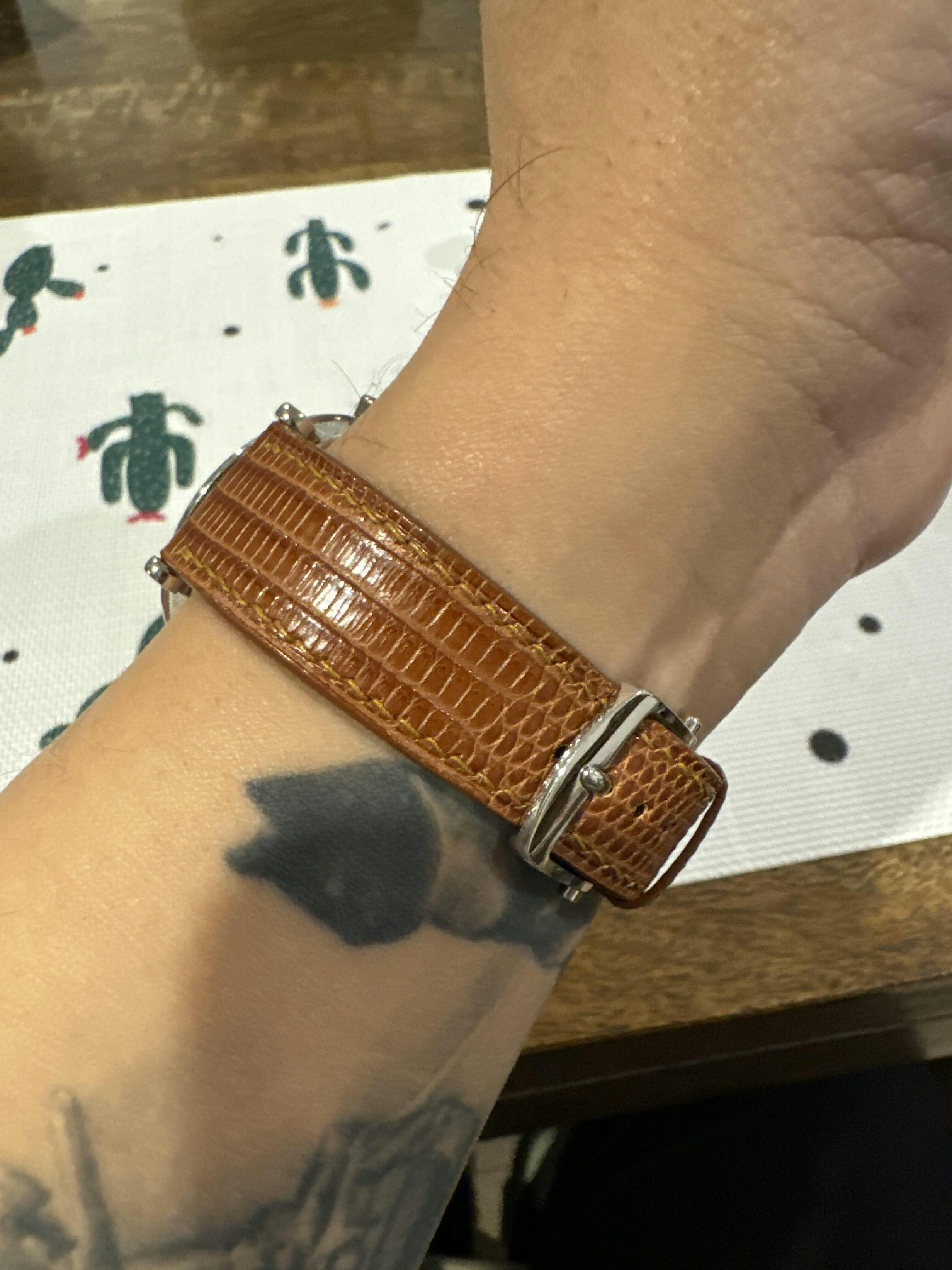 This whiskey lizard is a vibrant mid-brown leather with small rectangular scales tapering down to round scales near the tail. It features a glazed finish and comes from the French tannery HCP (Hermes). This whiskey lizard is the perfect strap if you want something elegant but not overly dressy. We see this strap pairing particularly well with warm-toned watches (i.e. creamy dials, gold watches,  brown dials)